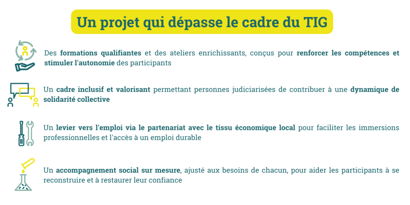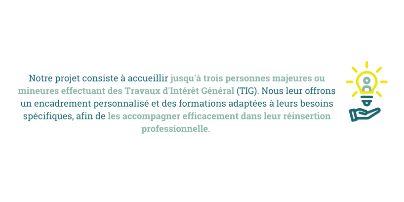 Le plus grand défi de notre projet, c’est de toucher les cœurs, de prouver que derrière chaque TIG, derrière chaque personne en difficulté, il y a une étincelle qui ne demande qu’à briller. C’est de coordonner une chaîne humaine, où chacun(e) – des personnes que nous accompagnons à nos partenaires et bénévoles – se sent valorisé et utile. Mais par-dessus tout, c’est de ne jamais perdre de vue cet espoir fragile, cette conviction que la réinsertion est possible, et que nous devons nous battre pour la rendre réelle. Et bien sûr, il y a la réalité matérielle : assurer un avenir financier à notre projet, pour que cette flamme continue d’éclairer des vies, et que nos rêves d’ACI et d’EVS deviennent réalité.